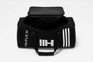 Durable and stylish gym bag with spacious storage, shoe pocket, secure zippers, and organized compartments. Sleek black design with Triple H logo—perfect for gym, travel, and daily use.