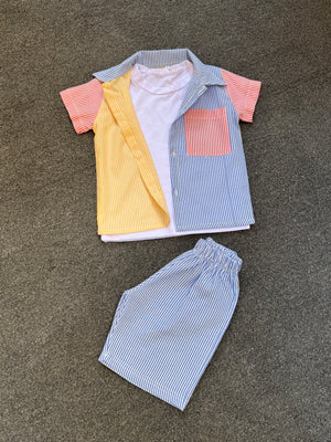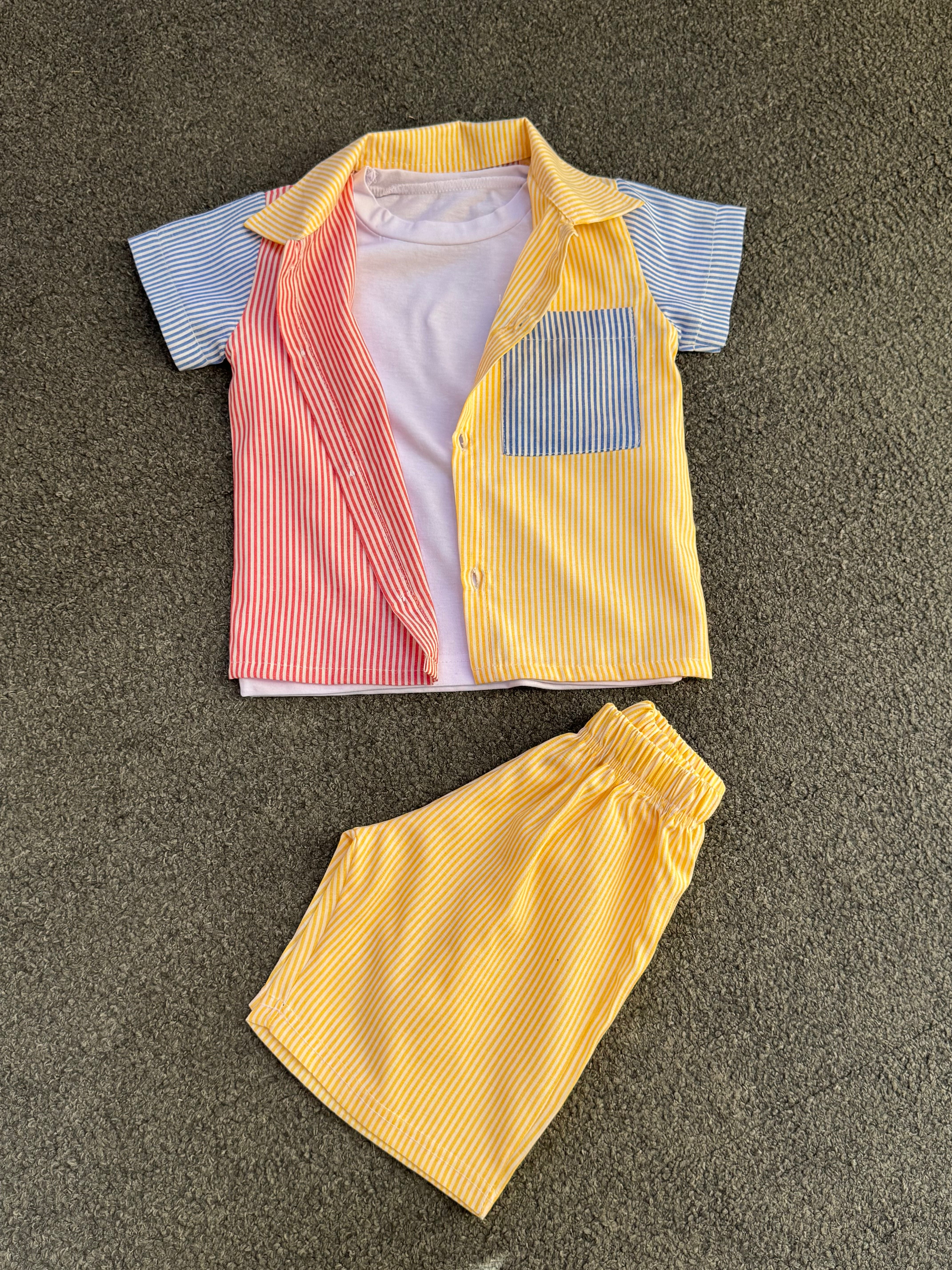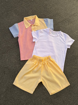 Keep your child stylish and comfortable with this trendy 3-piece outfit. It includes a lightweight Dacron cotton shirt, a soft 100% cotton basic T-shirt, and matching shorts. Designed for everyday wear or special occasions, this set combines breathable comfort with a modern, polished look. Available in trendy colors your little one will love.