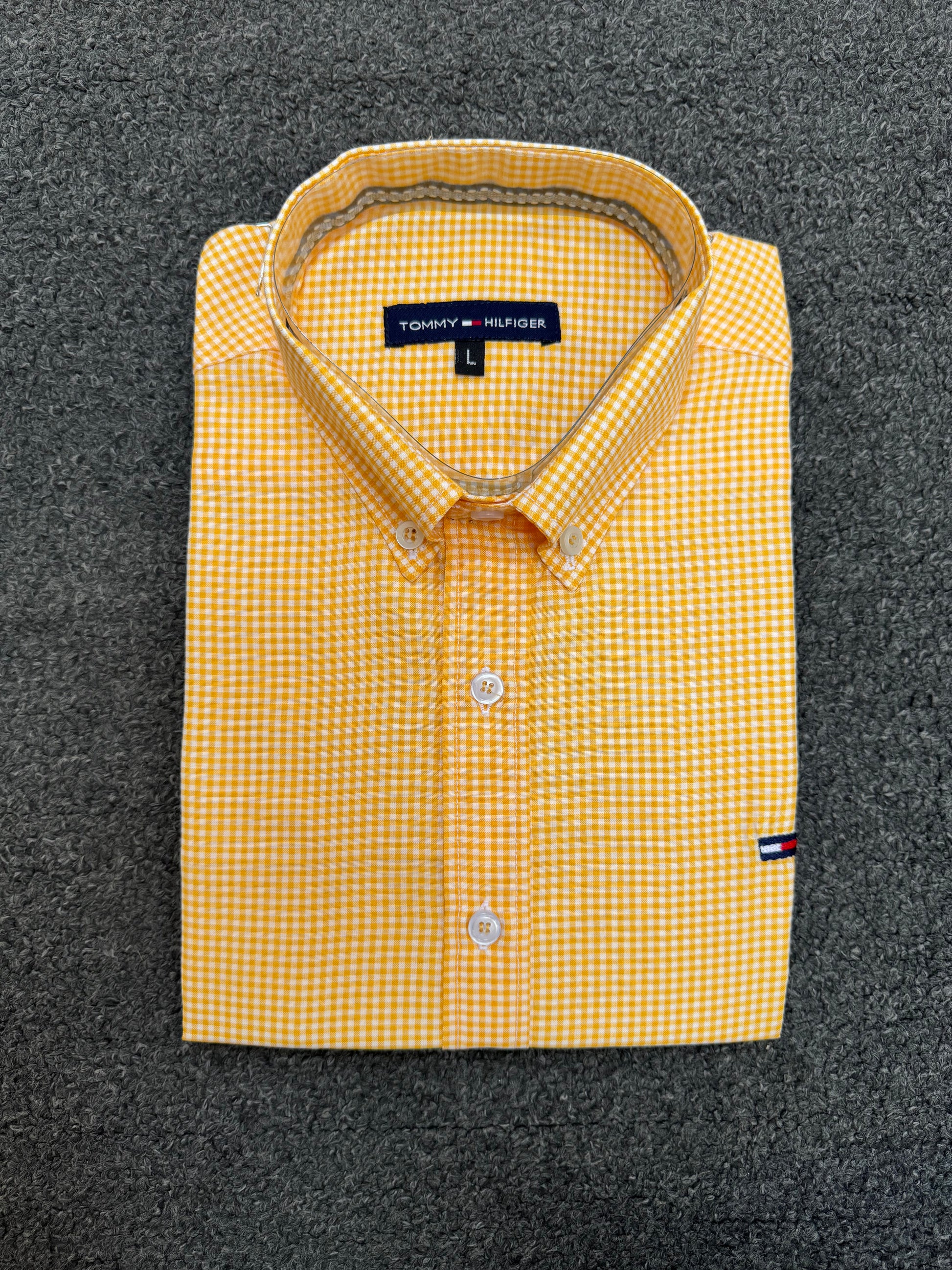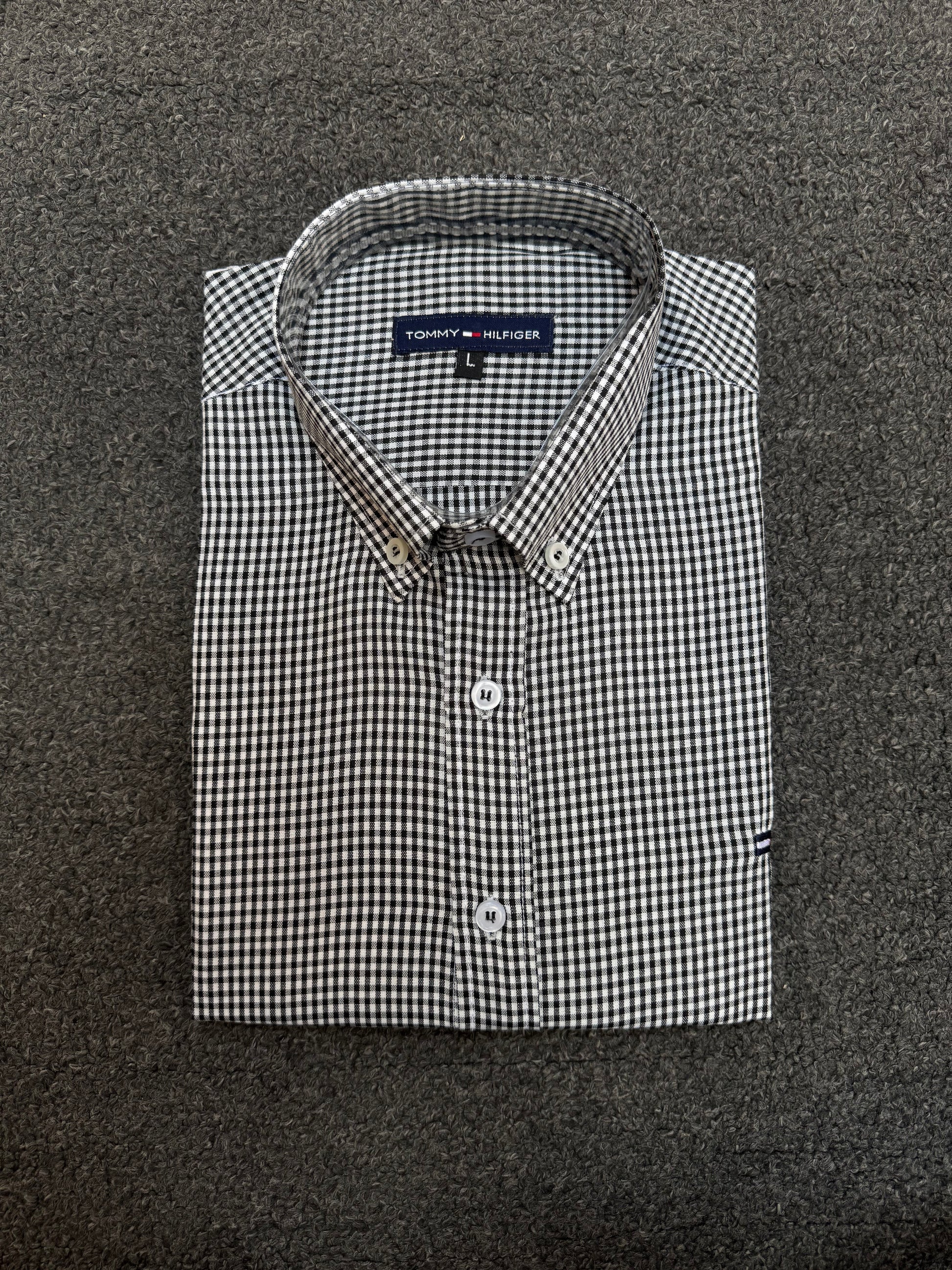 Stylish Tommy checkered shirt made from treated Dacron fabric, resistant to lint, shrinkage, and fading. Features an embroidered laser-cut Tommy logo and a comfortable regular fit. Available in sizes L, 2XL, 3XL, 4XL, and 5XL.